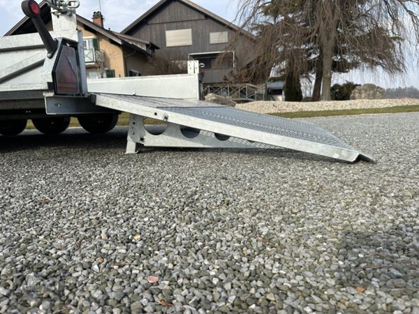 Die 130 cm lange Heckklappe fungiert gleichzeitig als Rampe und erleichtert das Auf- und Abladen von Fahrzeugen und Maschinen. Dank der 100 km/h Zulassung ist der Anhänger auch für längere Strecken bestens geeignet.