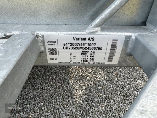 Der Variant Anhänger Baumaschinenanhänger Tridem 3500 kg PKW Hänger ist eine vielseitige Transportlösung für Baumaschinen und schwere Lasten. Dieses Modell, Baujahr 04/2024, bietet mit seinen Innenmaßen von 4600x1980 mm eine großzügige Ladefläche von 9 qm. Die geringe Ladehöhe von nur 380 mm ermöglicht ein einfaches Be- und Entladen.