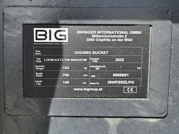 2025 BIG TIEFLÖFFEL 70CM MIT MS03 SYMBLOCK AUFNAHME Technische Daten: * Gewicht: 103 kg * Aufnahmebreite: 70 cm * Inhalt: 149 ltr. * KAT 3 - passend zu 2.8 - 3.9t Bagger