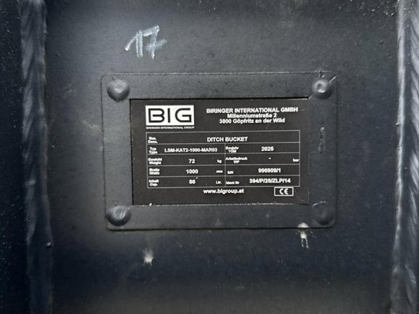 2025 BIG BÖSCHUNGSLÖFFEL 100CM MIT MARTIN M3 AUFNAHME Technische Daten: * Gewicht: 72 kg * Aufnahmebreite: 100 cm * Inhalt: 86 ltr. * KAT 2 - passend zu 1.9 - 2.7 t Bagger