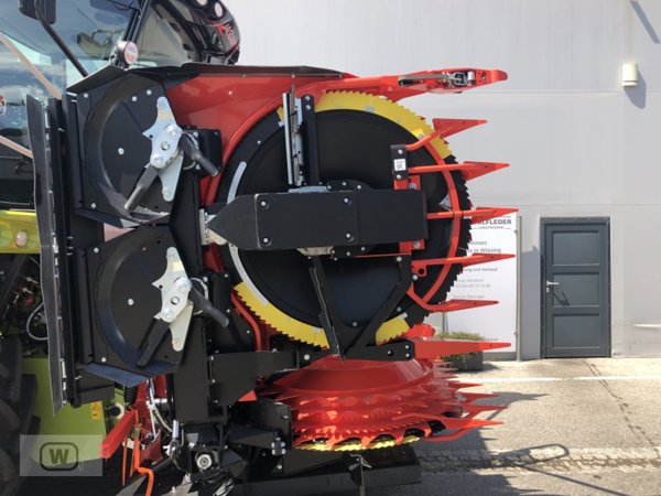 Die Auto Contour Bodenanpassung und die hydraulisch klappbaren Tasträder des mitgelieferten Pick Up 300 Profi Contour gewährleisten eine optimale Bodenanpassung auch in unebenem Gelände. Zusammen mit dem Orbis 750 TS Maispflücker mit 5 Zinkenreihen sind Sie für verschiedenste Erntebedingungen bestens gerüstet.