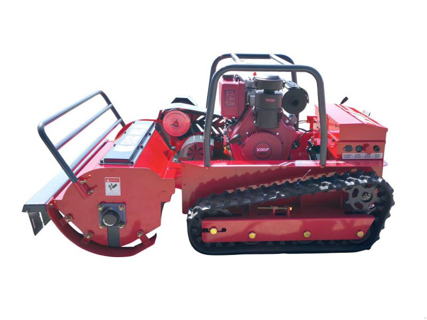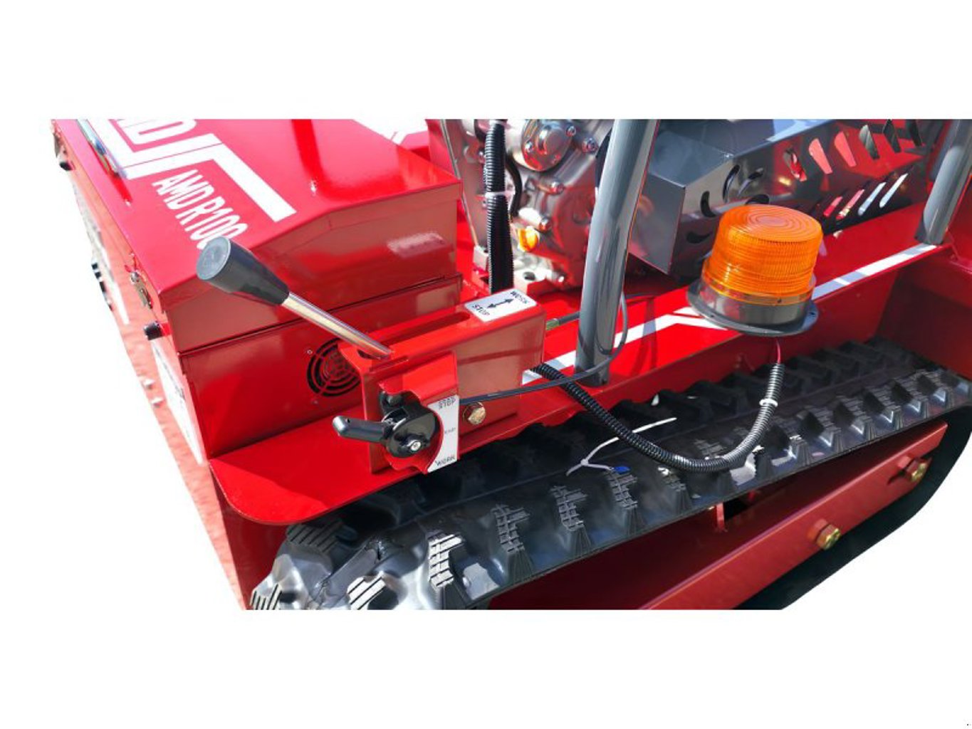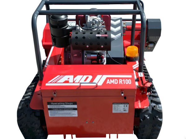 Angetrieben wird der Mäher von einem 12 PS starken Dieselmotor vom Typ 192F des Herstellers KOOP. In Kombination mit dem Raupenlaufwerk bietet der AMD-R100 hohe Traktion und sichere Arbeitsbedingungen an Hängen mit bis zu 40° Neigung. Die Fernsteuerung sorgt für einen sicheren Abstand zum Arbeitsbereich und erhöht die Arbeitssicherheit deutlich.