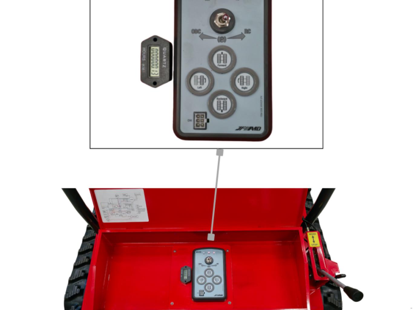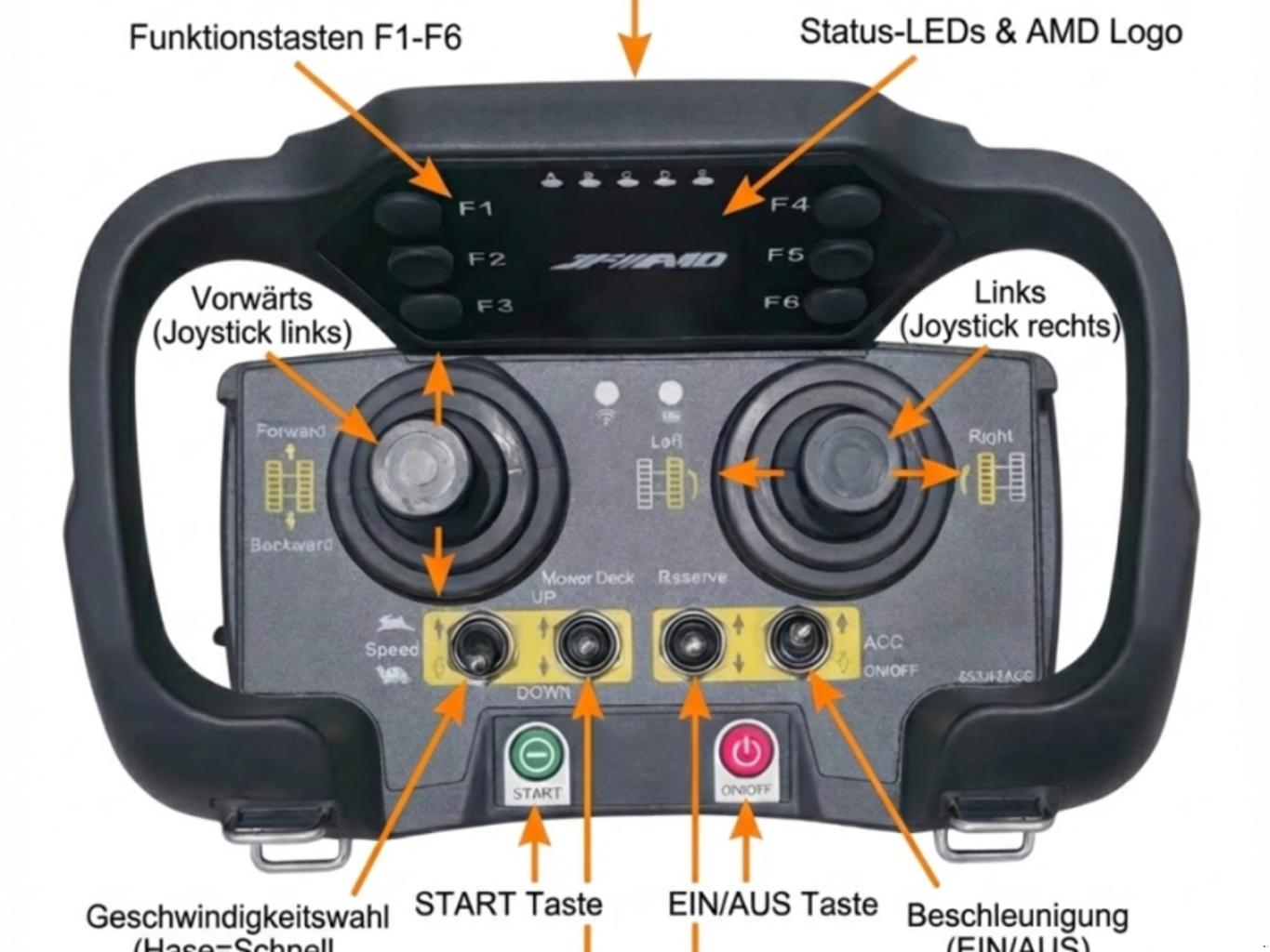 Ein wesentlicher Fortschritt gegenüber dem Vorgänger ist die elektrische Schnitthöhenverstellung. Während die Schnitthöhe beim früheren Modell manuell eingestellt werden musste, lässt sie sich beim aktuellen AMD-R100 bequem und stufenlos per Fernbedienung von 20 bis 200 mm anpassen. Das ermöglicht schnelle Reaktionen auf wechselnde Geländebedingungen und spart Zeit bei der Arbeit.