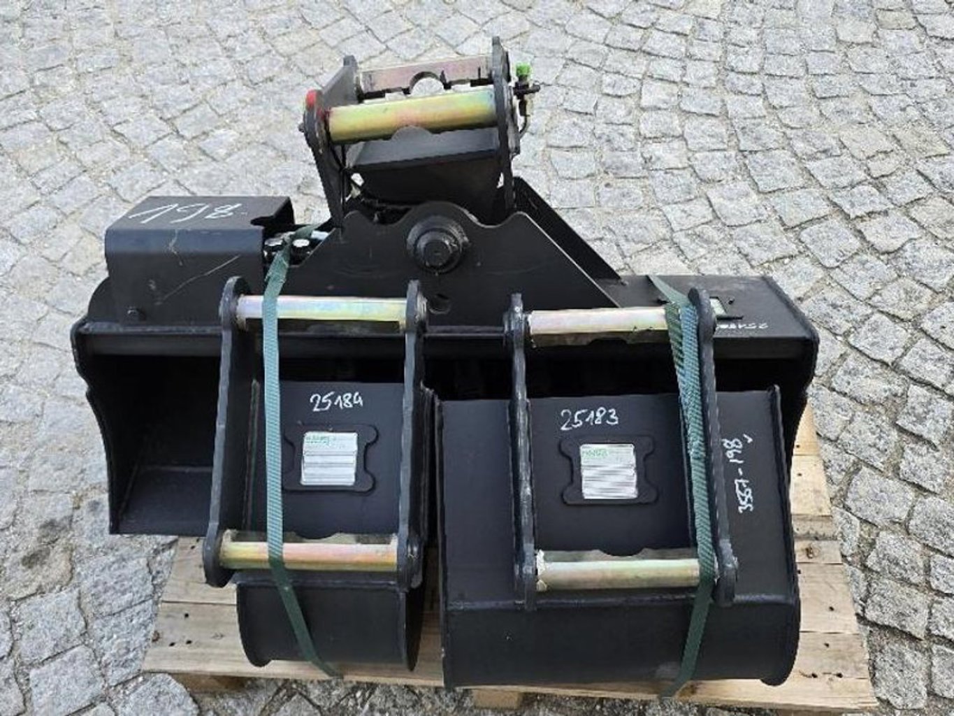 Löffelset passend zu Lehnhoff SW01/MS01 mit Symlock Aufnahme * 100cm Böschungslöffel/Schwenklöffel - 74l Volumen - 90kg * 40cm Tieflöffel mit 3 Zähnen (abschraubbar) - 46l Volumen - 38kg * 20cm Tieflöffel mit 2 Zähnen (abschraubbar) - 20l Volumen - 28kg Passend zu 1,5-2,5t Bagger