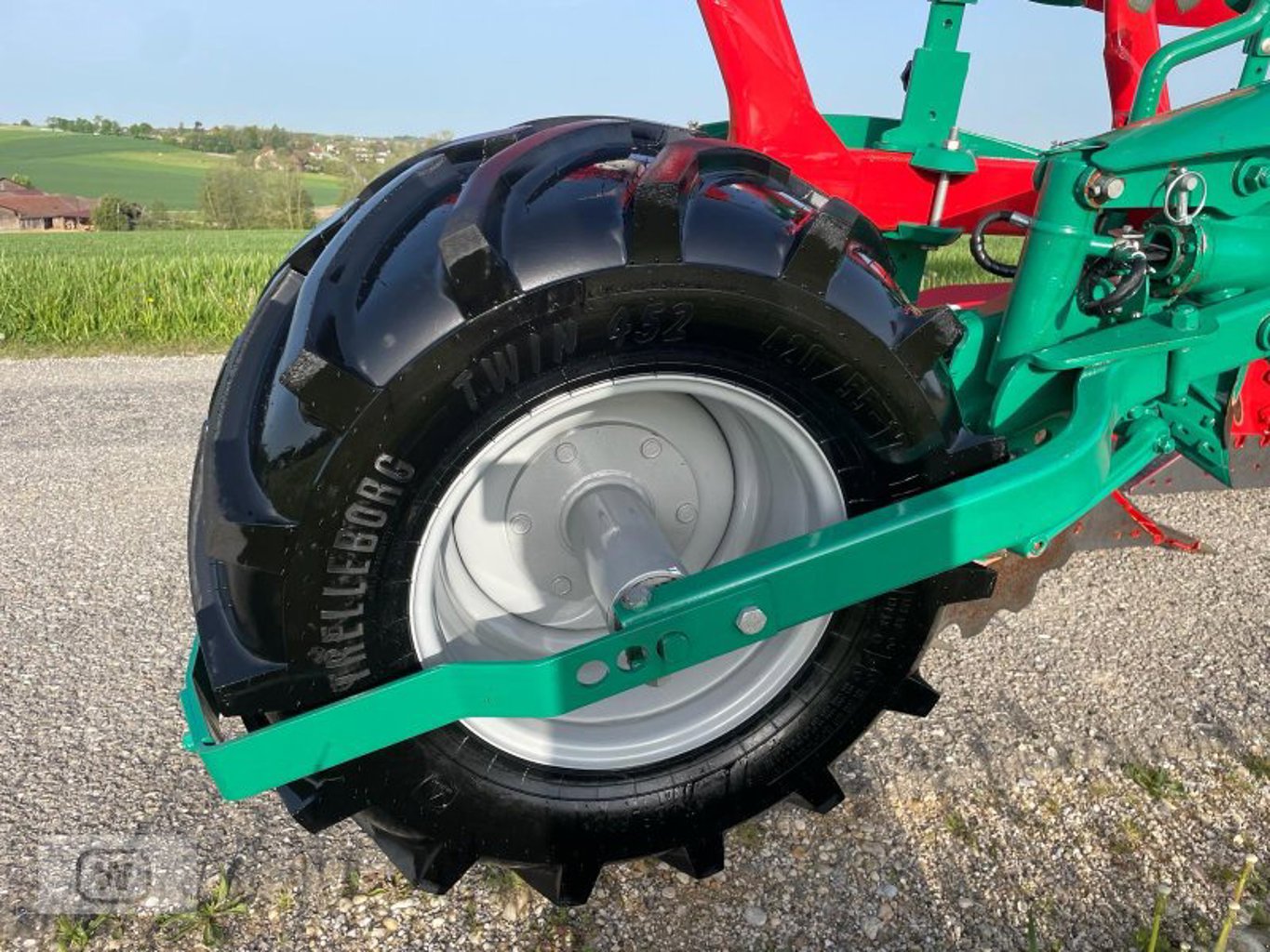 Das revolutionäre, vorgesetzt montierte Laufband (65 x 30 cm) deckt die Arbeitsbreite des Pfluges ab und ist ideal für feuchte Bodenverhältnisse.