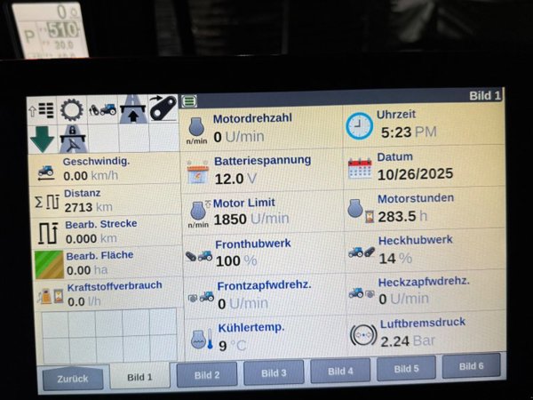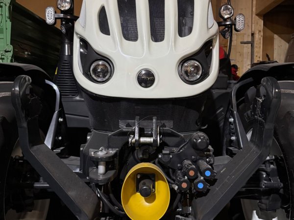 Klimaanlage, Hydrac Frontladerkonsole, Fronthubwerk, Frontzapfwelle, vorne 2 dw stg., hinten 2 dw stg., Reifen hinten 480/65r28 (90°), Reifen vorne 340/80r18 (70°), Zwillingsreifen hinten, Schneeketten vorne und hinten (Netzketten)