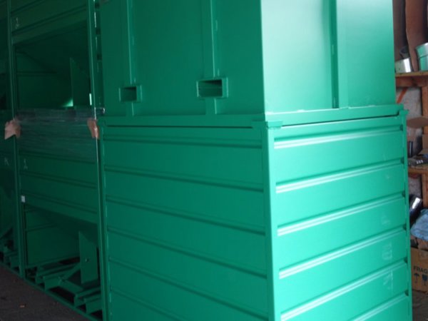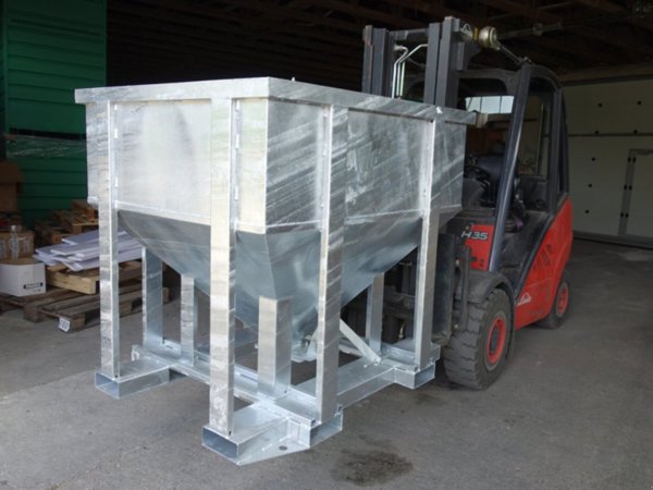 HDT Stahlblechcontainer zur Belüftung/Abtrocknung, Beschickung und Lagerung von allen rieselfähigen Ernteprodukten. Abmessungen: 1,5m x 1,2m (LxB) und Höhen von 1,0m - 1,8m in lackierter, verzinkter oder Edelstahl-Ausführung, mit glatten oder gesickten Wänden. Ausgeführt mit Flach-/Schräg- oder Trichterboden mit oder ohne handbedientem Auslaufschieber. Luftzuführung über Lochblech-/Drahtgewebe-Boden oder Belüftungsbalken. Manipulierbar mit Gabelstapler, Hubwagen und Drehkranz, wobei die Container an allen 4 Seiten Staplerführungen aufweisen und an den 2 kurzen Seiten Öffnungen für die Aufnahme mit Hubwagen haben. Wir liefern einzelne Trocknungscontainer oder planen und liefern auch komplette Trocknungsanlagen inkl. Warmluftquelle, Ventilator, Belüftungskanal, Verteiler, etc.. Alle HDT Trocknungscontainer können separat belüftet werden. Optionale Zusatzausstattungen, wie ein Auslaufstutzen mit Schlauch, ein leichter Aludeckel, eine Abdeckplane oder Schwerlasträder erweisen sich für vor allem bei der Beschickung von Sämaschine und Reinigern und der hygienischen Lagerhaltung als sehr praktisch. An Sondercontainern können wir u.a. Sammelcontainer für Staub, Asche oder Abfälle anbieten sowie Big-Bag Absackgestelle. - Preis: Auf Anfrage