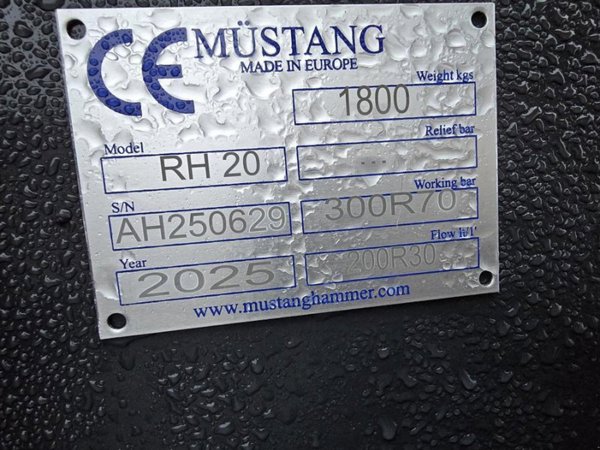 Mustang RH20 Abbruchpulverisierer Technische Daten: * Gewicht: ca. 1800 kg * Einsatzbereich: Für Bagger von 18 bis 22 Tonnen * Hydraulikdruck: 300 bar * Hydraulikdurchfluss: 140/200 L/min * Max. Backenöffnung: 670 mm * Pin-Größen: 80 mm Durchmesser * Abmessungen: 195 cm lang x 56 cm breit x 121 cm hoch (ohne Palette) * Rotation: 360° hydraulische Rotation * Weitere Merkmale: Schneide zum Zerspanen von Bewehrungsstahl, verschleißfeste Platten und austauschbare Zähne an den Backen