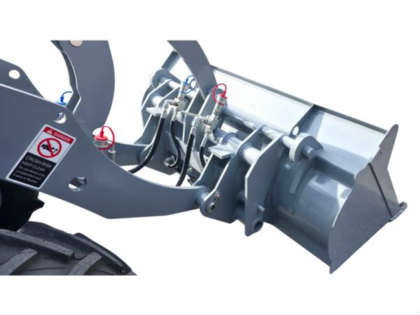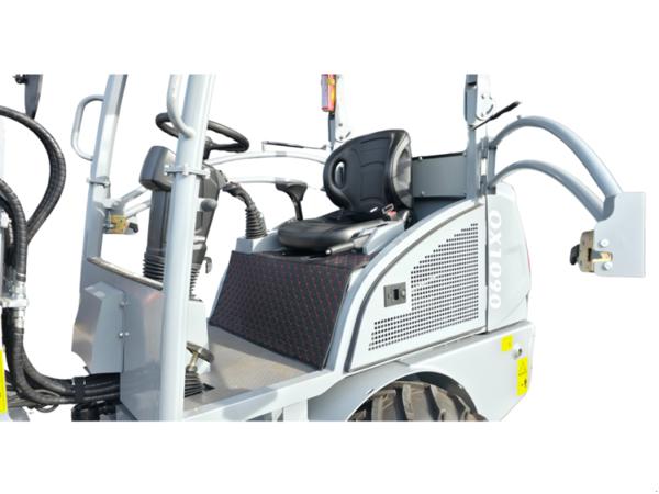 Der hydraulische Schnellwechselrahmen mit Euro-Aufnahme und zusätzlichem Steuerkreis macht den OX1090 vielseitig einsetzbar. Anbaugeräte wie Schaufel, Palettengabel oder Schneeschild lassen sich schnell und sicher wechseln. Großzügige Sichtverhältnisse, LED-Arbeitsscheinwerfer und vollständige Straßenbeleuchtung unterstützen einen sicheren Betrieb bei allen Lichtverhältnissen.