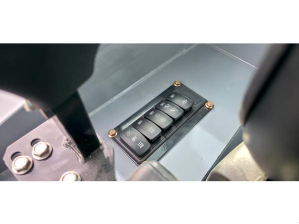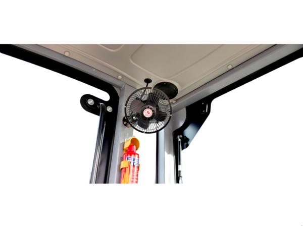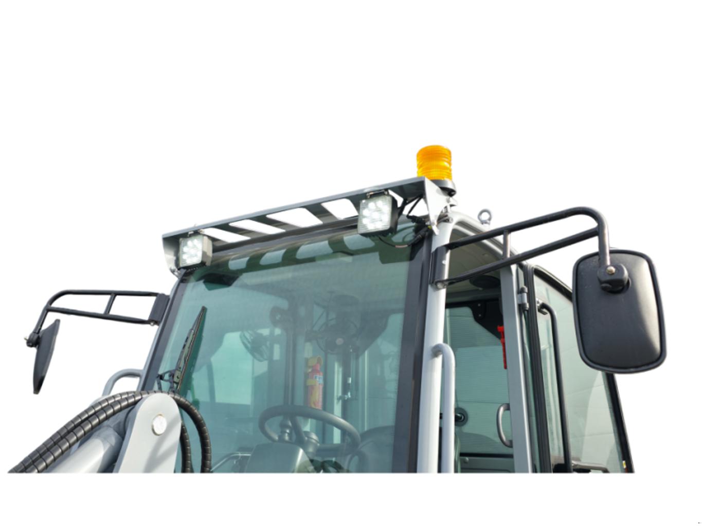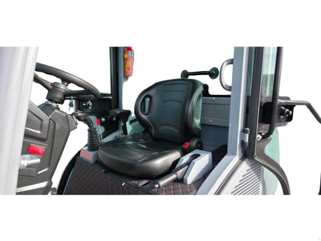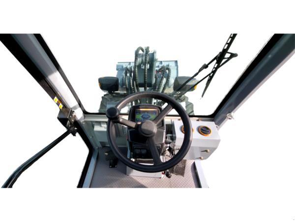 Die geschlossene Vollkabine mit Heizung, Klimaanlage, Lüfter und Radio bietet ein angenehmes Arbeitsumfeld bei Hitze, Kälte und Staub. Große Glasflächen gewährleisten eine gute Rundumsicht, während LED-Arbeitsscheinwerfer und vollständige Straßenbeleuchtung einen sicheren Betrieb bei schlechten Lichtverhältnissen ermöglichen.