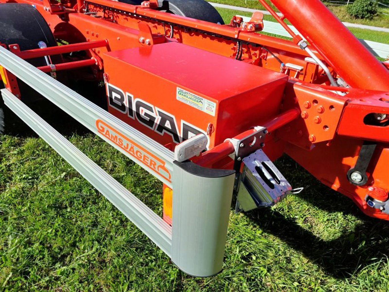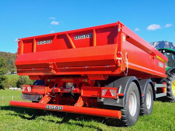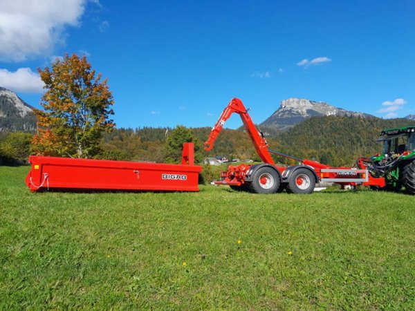 Bigab B12 Hakenliftanhänger in dieser Ausstattung mit Lenkdeichsel, hydraulischer Containersicherung, Druckluftbremsanlage, 40km/h Ausführung und typisiert, Unterfahrschutz, mit oder ohne Container, elektrischer Bedienung.