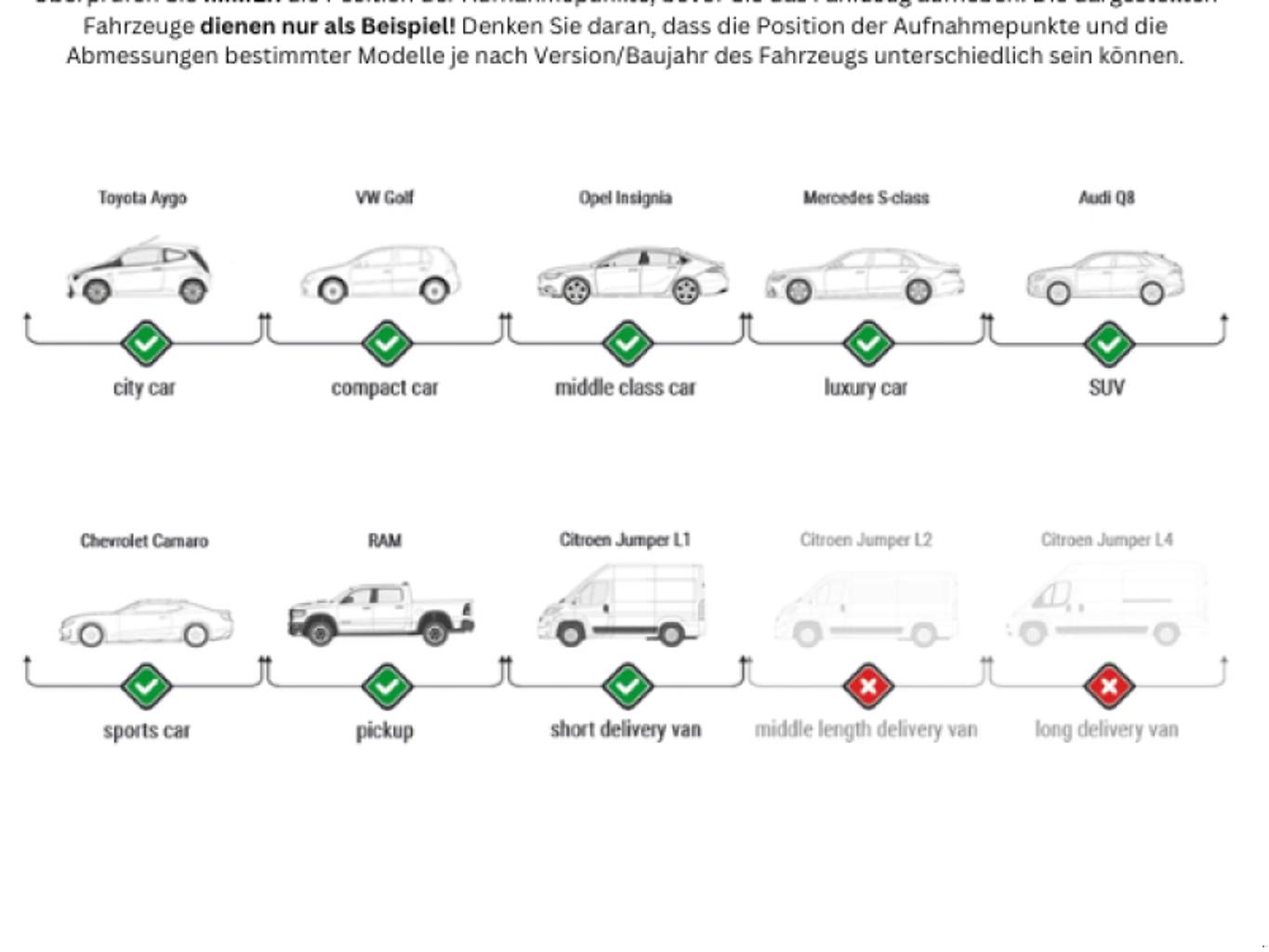 Verwendbar für sehr breite Autos: max. Wagenbreite 2500 mm
