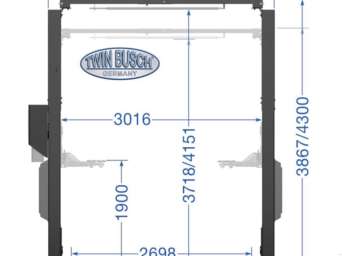 Höhe der Hebebühne je nach Decken- oder Fahrzeughöhe zwischen 3867 mm und 4300 mm wählbar