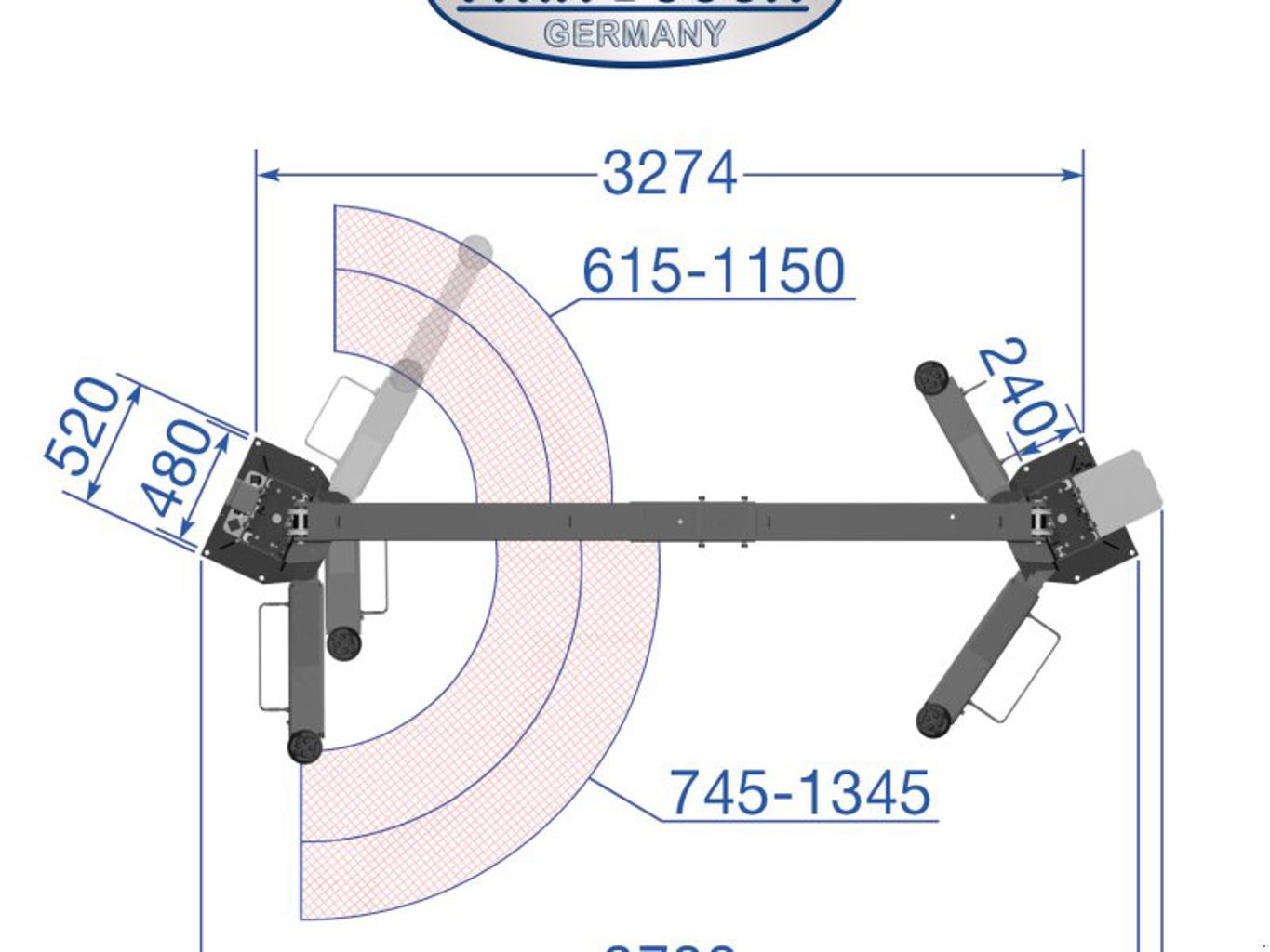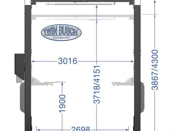 Bei symmetrischer Montage ist die Durchfahrbreite (zwischen den Säulen) zwischen 2872 mm und 3016 mm wählbar.