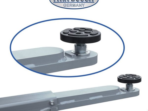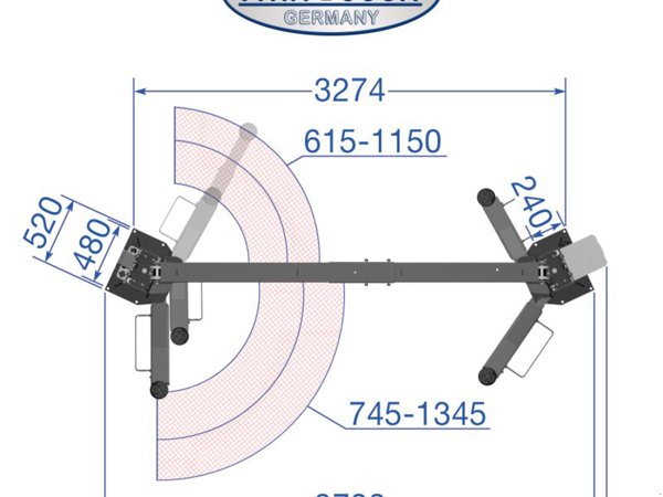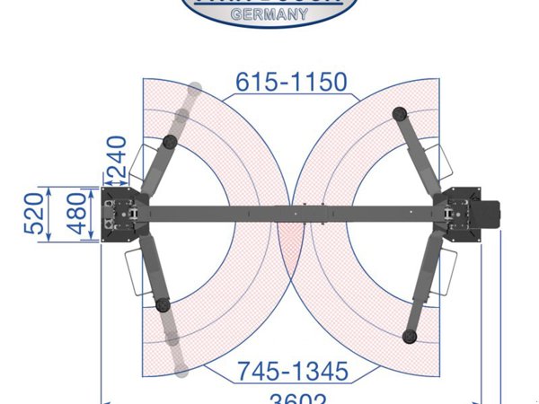 Sie verfügt über eine automatische Entriegelung der Sicherheitsriegel sowie über zweistufig höhenverstellbare Drehteller mit einer Einschwenkhöhe von nur ca. 85 mm. Zudem besitzt die Hebebühne 3-teilige teleskopierbare Tragarme für einen großen Aufnahmebereich.