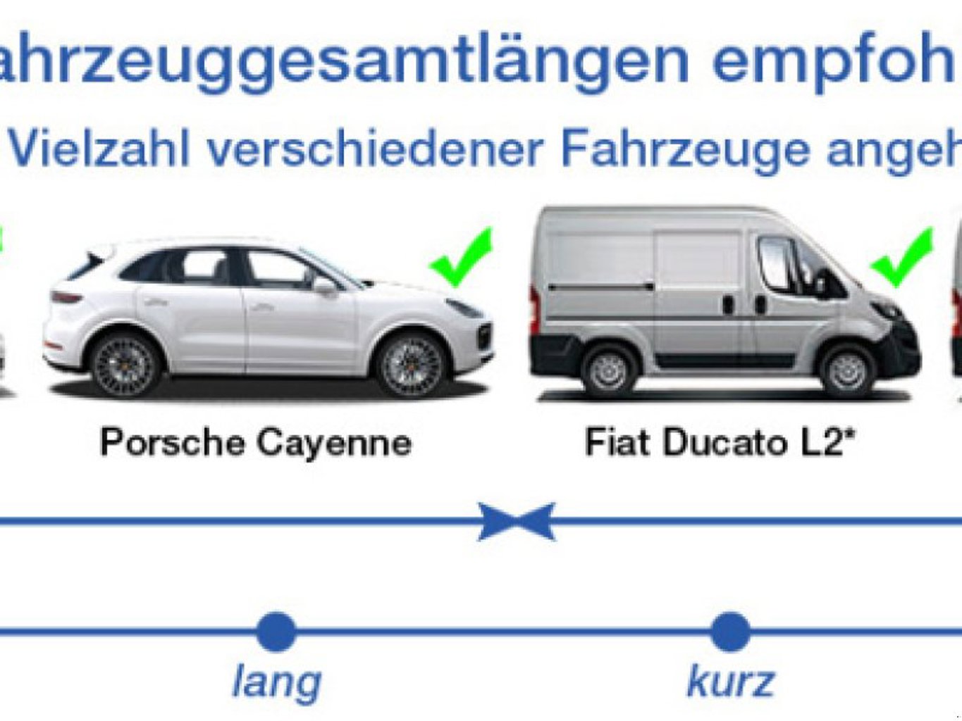 Durch ihren extrem großen Verstellbereich lässt sich vom Kleinwagen (z. B. Smart) bis hin zum Transporter, auch mit langem Radstand (z. B. MB Sprinter, Wohnmobile, Sonderfahrzeuge) alles problemlos anheben (siehe unten „Empfehlung Fahrzeugtypen / Radstände“).