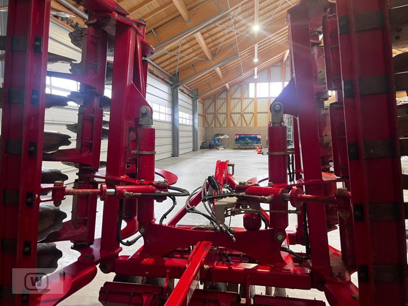 Die Scheibenegge ist mit insgesamt 24 Scheiben ausgestattet, die in zwei Reihen zu je 12 Scheiben angeordnet sind. Diese Konfiguration sorgt für eine gleichmäßige und gründliche Bearbeitung des Bodens. Die massive Bauweise der Maschine trägt zur Langlebigkeit und Stabilität bei der Arbeit bei.