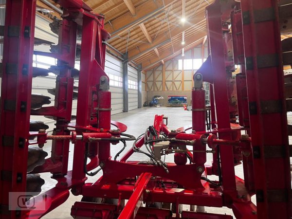 Die Bearbeitungstiefe lässt sich hydraulisch verstellen, was eine komfortable und schnelle Anpassung an unterschiedliche Bodenverhältnisse und Arbeitserfordernisse direkt vom Schlepper aus ermöglicht. Zusätzlich kann der Scheibenversatz mechanisch eingestellt werden, um die Arbeitsintensität je nach Bedarf anzupassen.