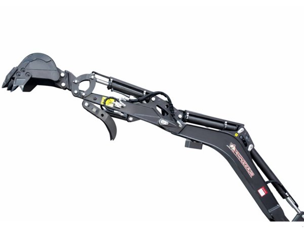 Das hydraulisch verstellbare Untergestell mit 800–1000 mm Breite ermöglicht maximale Flexibilität. In schmaler Stellung passt die Maschine durch enge Durchfahrten, in breiter Stellung bietet sie hohe Stabilität. Der serienmäßige Knickarm-Ausleger erweitert den seitlichen Arbeitsbereich erheblich und ermöglicht präzises Arbeiten entlang von Mauern und Hindernissen.