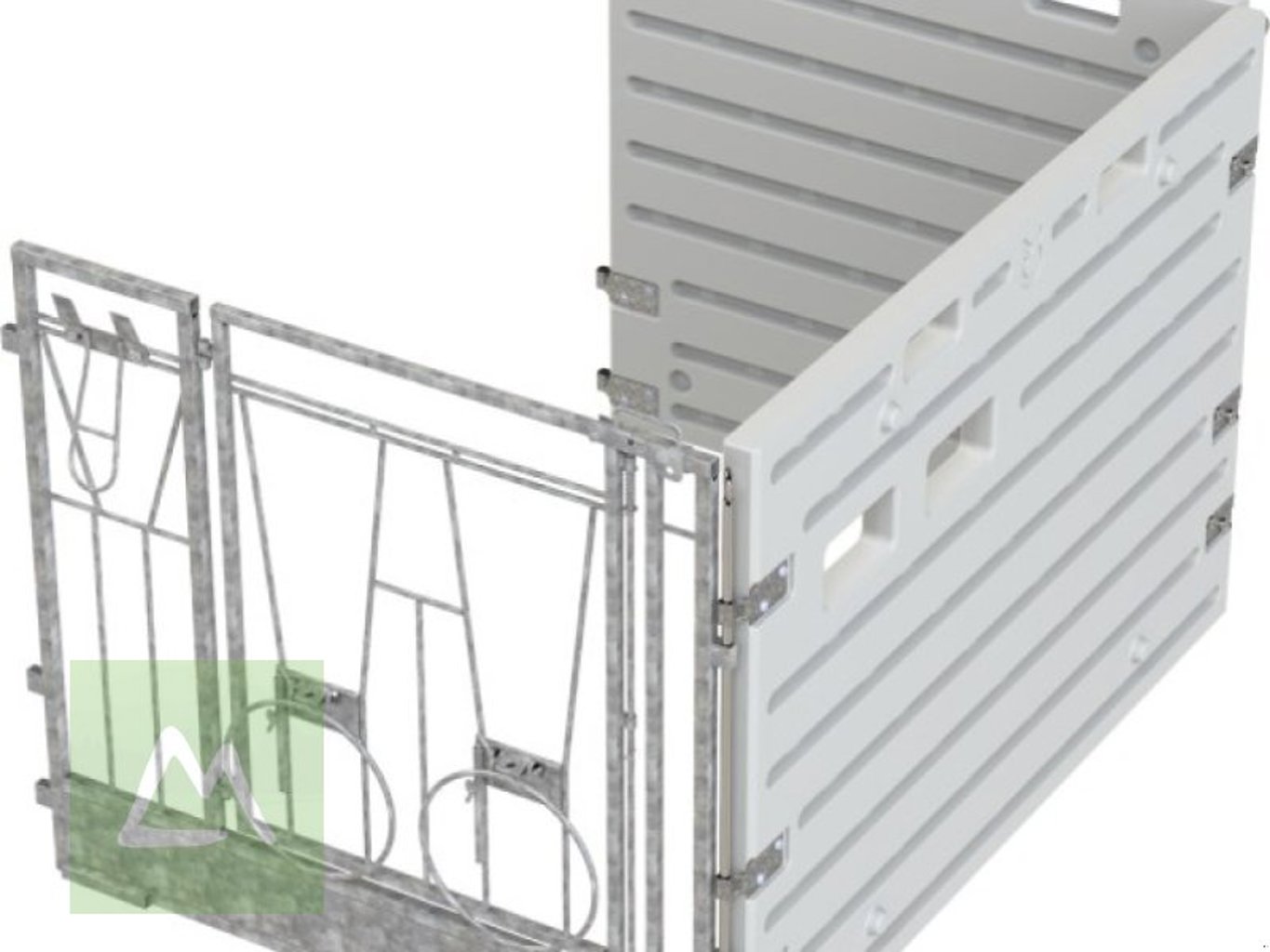 •Frontelement mit durchschwenkbarer Drehtür und feststehendem Tränkebereich, zum idealen Anlernen der Kälber an Nuckeltränken